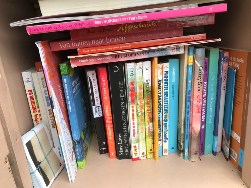 Per maart 2024 staan er veel kinderboeken in de minibieb. Zoals De reis met de vliegende leunstoel, Floortje Bellefleur redt een hondje en Floortje Bellefleur en de kinderkermis. Maar ook Vrouwenkloosters in Venetië en Terminal boredom. Interessante collectie!
