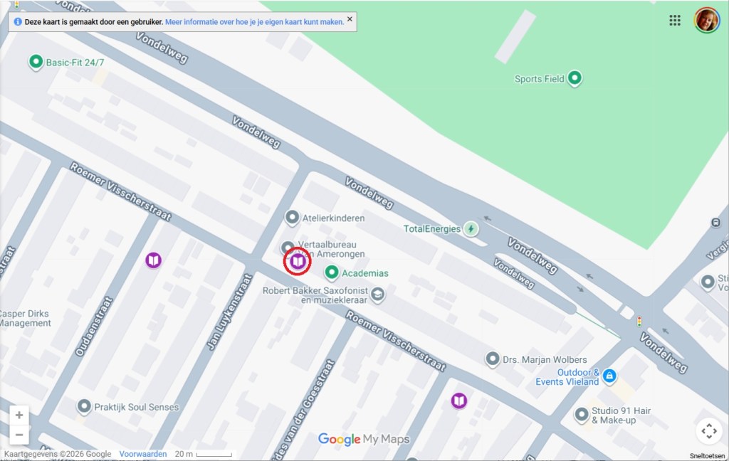 De minibieb staat in Haarlem-Noord, vlak bij de Vondelweg ter hoogte van voetbalclub Schoten. Op de kaart van Jacques Zuiderwijk: Minibiebs Noord-Holland vind je deze minibieb (zie foto) en alle andere minibiebs.