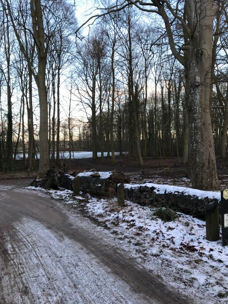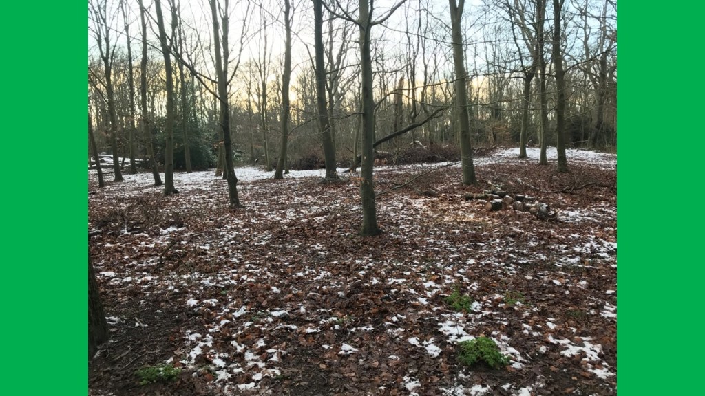 In het bos vind je oude loofbomen, in de lente staat het vol met daslook, en ook zie je wilde hyacint en blauwe anemoon. (Het is ook een populaire honden-uitlaatplek – ESC).