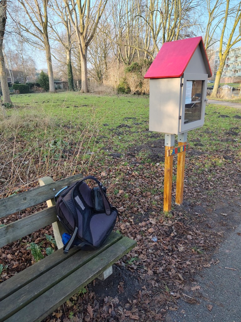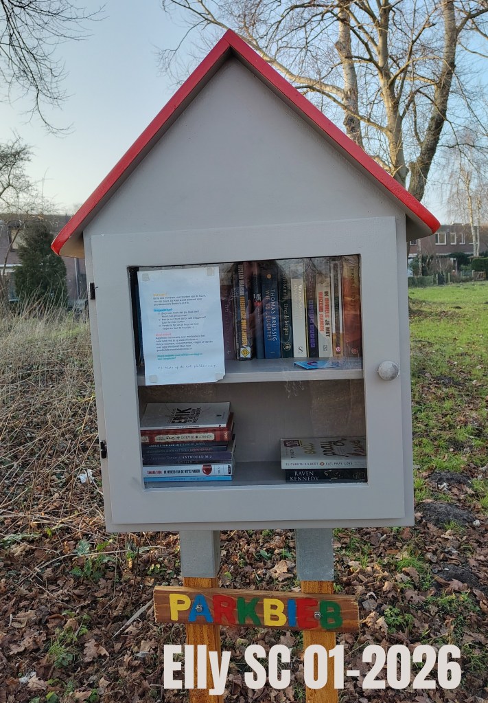 Elly SC was hier op 25 januari 2026 wat wel blijkt uit de karakteristieke foto-met-rugzak. “Mooi, biebje, in wit met en rood puntdak. Op de ruit een papier met wat informatie, onder andere wie de beheerders zijn. De Parkbieb is nieuw, en toch ook weer niet. Ik was hier namelijk eerder, in 2024. Ik had ergens gelezen dat hier een minibieb stond, maar toen ik hem vond, bleek hij net enorm gevandaliseerd te zijn. Inmiddels staat er een hele nieuwe kast, ik hoop dat hij heel blijft! De bieb en het bankje ernaast kijken uit op een stuk van de Meerwijkplas, met allerlei watervogels. Je kunt er fijn wandelen.”