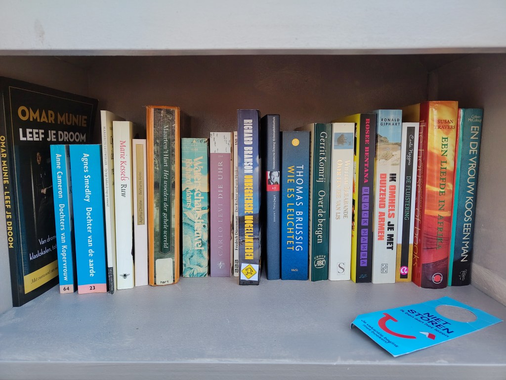Elly SC: “Er staat een mooie rij boeken in het biebje, hoofdzakelijk voor volwassenen. Mijn oog viel op het prachtige Waterschapsheuvel van Richard Adams, voor kinderen én volwassenen, want bepaald niet kinderachtig. Ik zette er Onbegrensde mogelijkheden van Richard Branson bij, wat gaat over zijn luchtvaartmaatschappij. En er staat nog veel meer, zie de bovenstaande slide-show.”