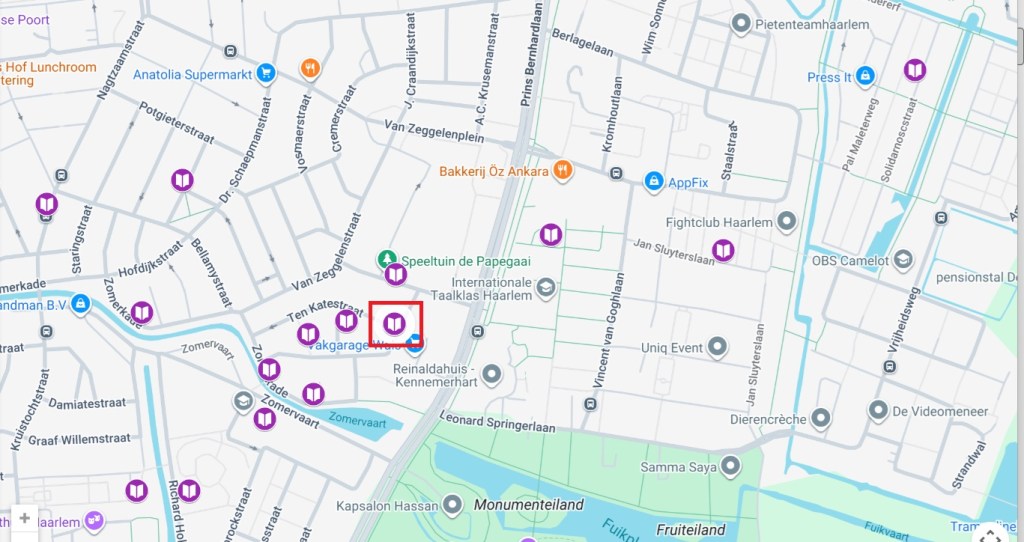 In de Van Zeggelenbuurt in Haarlem Oost hangt deze lieflijke lichtgroene minibieb in een haag van klimop. In de buurt is het grote Reinaldapark, de groen omzoomde Zomervaart en het historische Slachthuis. Er zijn 4 minibiebs vlak in de buurt.