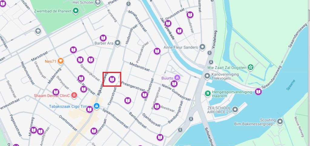 De minibieb staat in het noordelijke deel van de Indische buurt. Op de kaart van Jacques Zuiderwijk: Minibiebs Noord-Holland vind je deze minibieb (zie foto) en alle andere minibiebs.