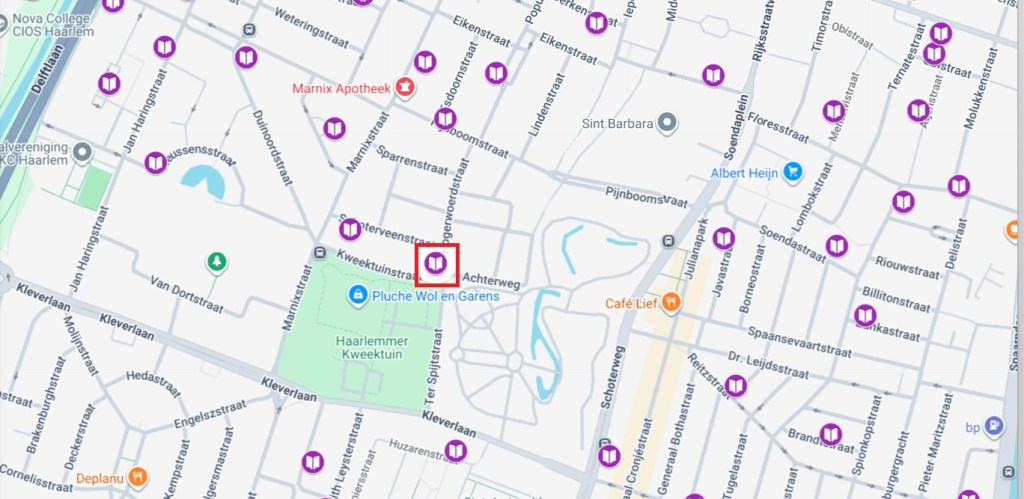 De minibieb staat direct ten noorden van de kweektuin, vlakbij de Kleverlaan dus. Op de kaart van Jacques Zuiderwijk: Minibiebs Noord-Holland vind je deze minibieb (zie foto) en alle andere minibiebs.