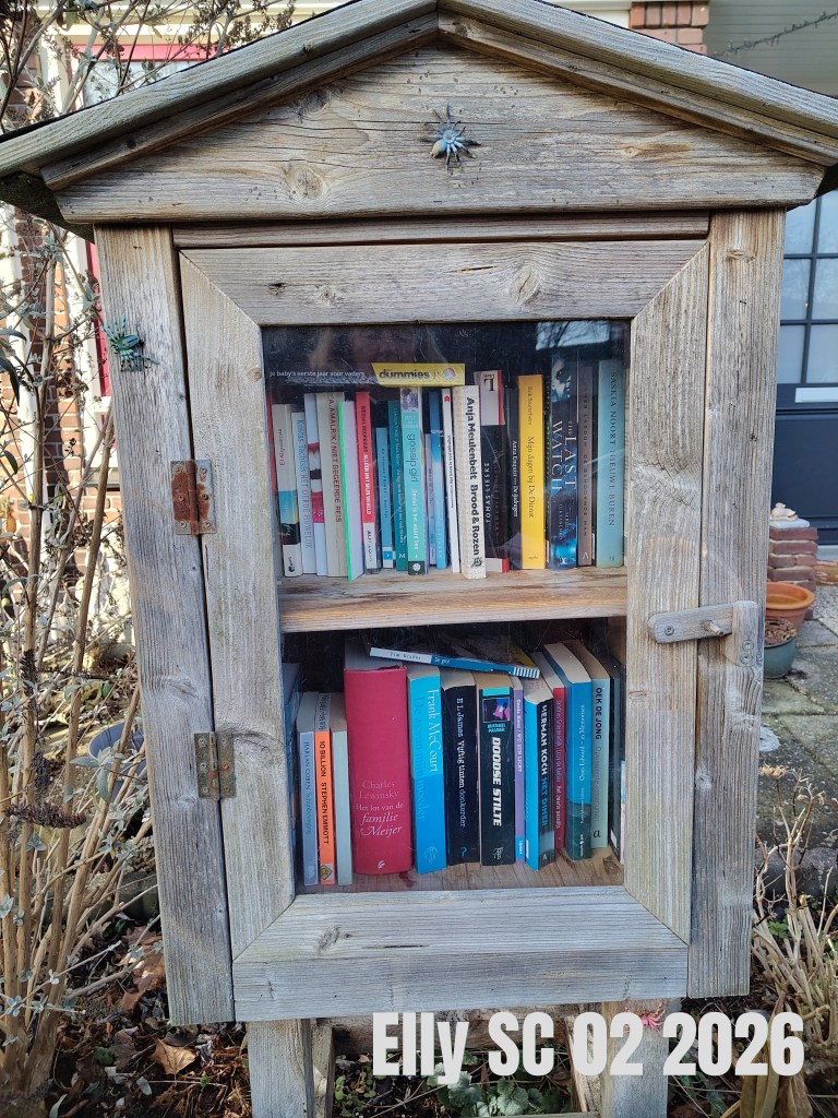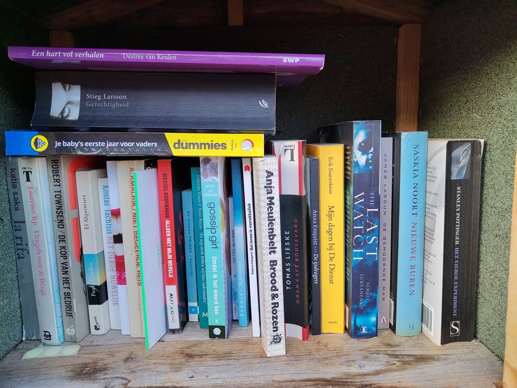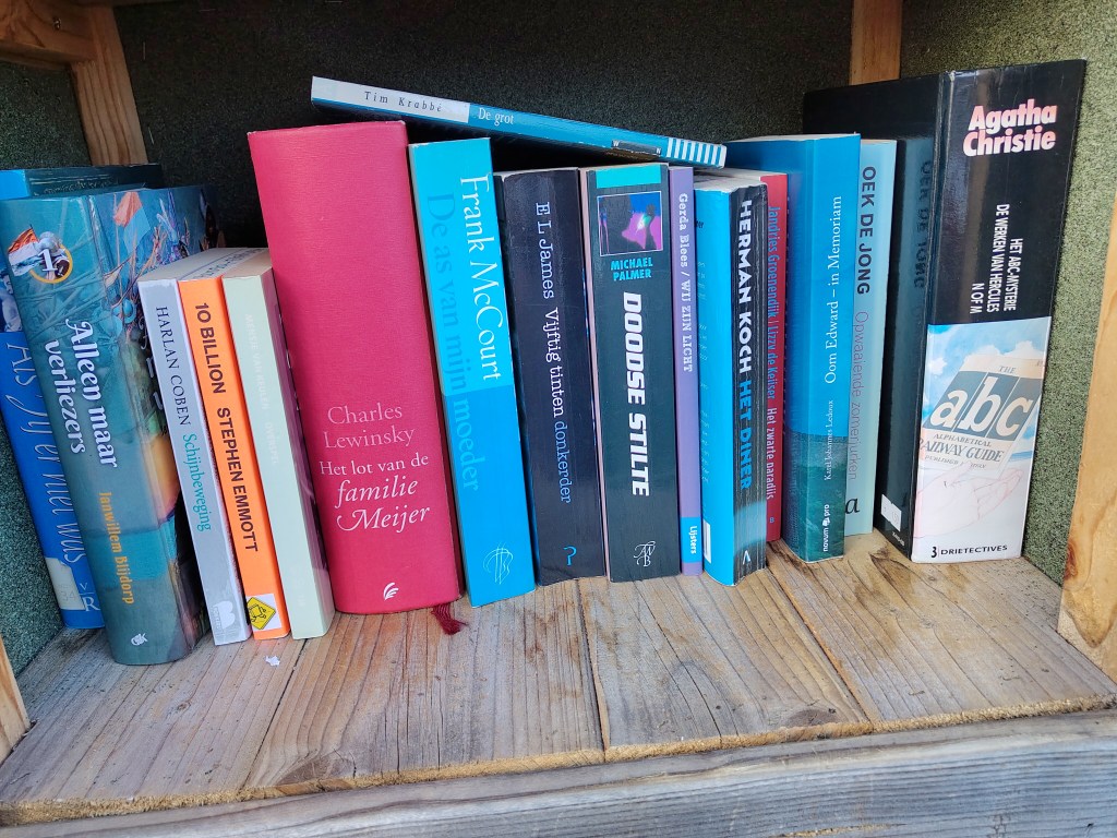Elly SC: “Een mooie collectie boeken! Voor volwassenen, ik zag geen kinderboeken staan. Mijn oog viel natuurlijk op de Filmomnibus van Agatha Christie, maar die drie had ik al gelezen, evenals Het diner van Herman Koch, wat ernaast staat. Erg goed boek! Mijn dagen bij De Dienst is een roman over het leven op kantoor, en lijkt erg grappig te zijn.
