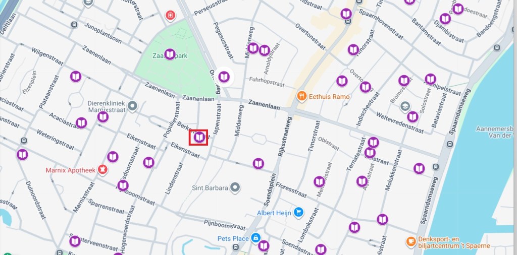 In de Bomenbuurt in Haarlem-Noord staat op de Berkenstraat 5 deze bijzondere minibieb. In de buurt vind je het Zaanenpark en het oude Raadhuis van Schoten. Vlakbij vind je 3 andere minibiebs.