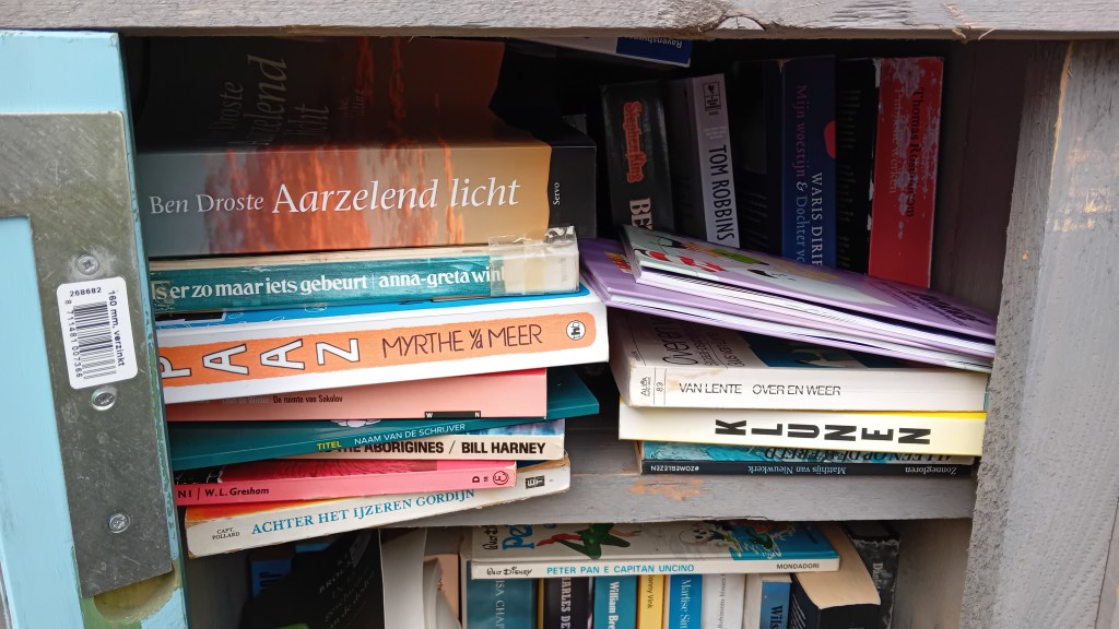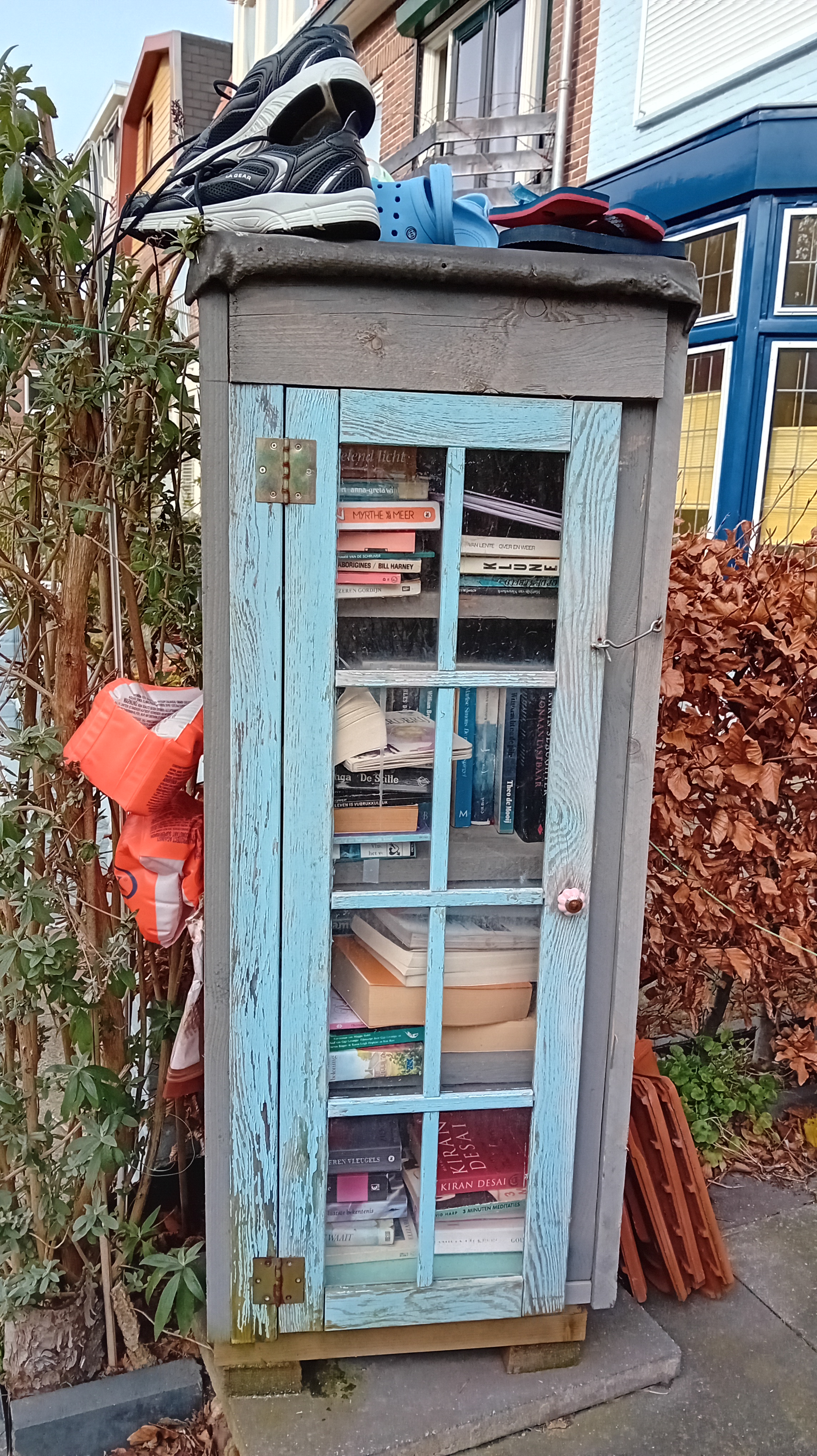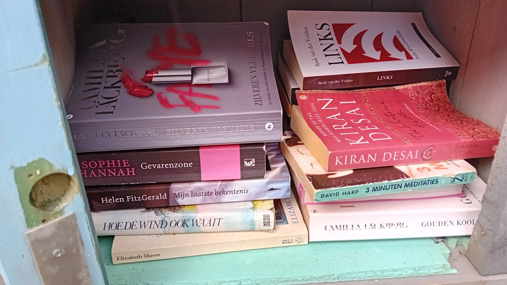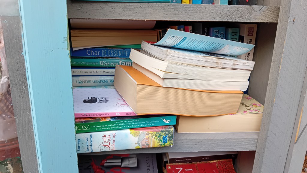 Anne-Marie J: “Laat me je boekenkast zien en ik vertel je wie je bent. Zou deze uitspraak ook gelden voor buitenboekenkasten? Ik werd in ieder geval nieuwsgiering naar de eigenaren. Ik vond de boekenkast knus – ondanks de omvang, en gezellig rommelig. En de kast heeft maar liefst 4 planken. Je vindt er een grote diversiteit aan boeken. Zo zag ik een boek van Myrthe v/d Meer, van Waris Dirie, Karin Slaughter, Kiran Desai en Camilla Lackberg. Voor ieder wat wils. Voor deze grote boekenkast zou ik je daarom aanraden even de tijd te nemen, er is veel te zien. En misschien heb jij dan ook een ontmoeting met de prachtige, vriendelijke grijze kat.”