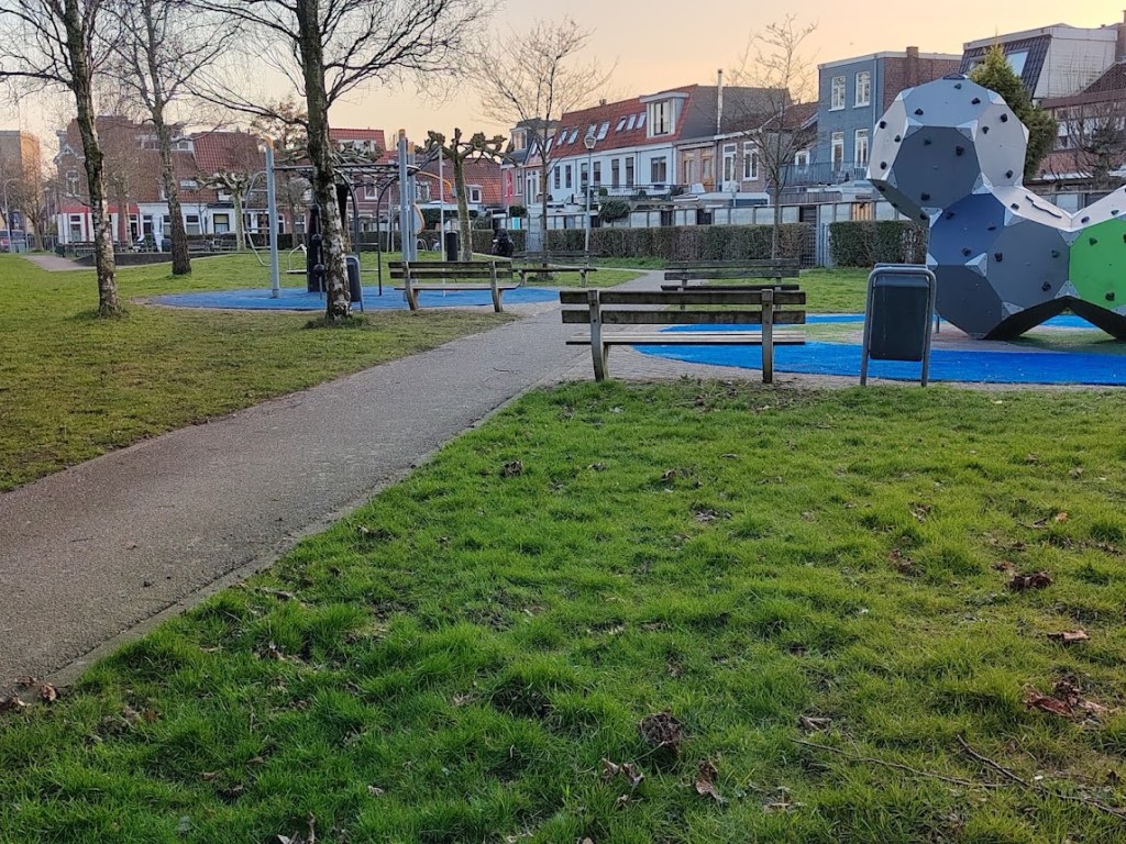 Op het Nadorstplein kun je niet aan de drank, maar wel even uitpuffen op een bankje terwijl de kids de speeltuin ingaan.