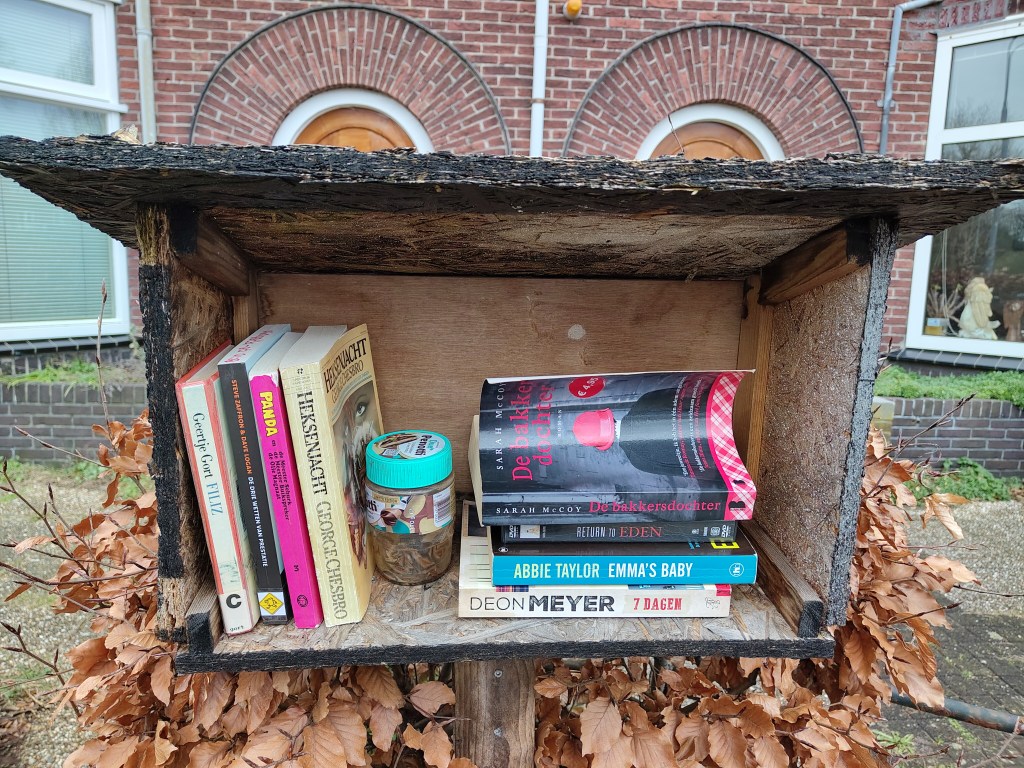 Elly SC was hier op 21 februari 2026. “Het deurtje is weg en er staat een lege pot pindakaas. Wat moet ik daar nu van denken? Op dat moment komt de beheerder uit het huis. Hij vertelt dat de bedoeling was om zijn eigen boeken erin te zetten, maar dat hij daar toch wat moeilijk afscheid van neemt. Ik probeer subtiel aan te geven dat je ook niet zo makkelijk een boek in een open kast achter;aat, zo zonde. Of hij het kastje niet kan repareren? Misschien, en hij loopt haastig weg naar zijn auto. Op 8 maart bezocht een van mijn BookCrossing collega’s dit biebje. Niks gerepareerd, en nog leger dan ervoor. Ze nam mijn boek mee, had daar nog wel een droog plekje voor in Den Haag.