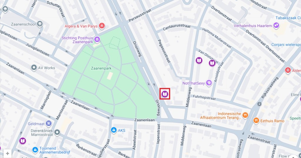 De minibieb staat nét boven het Zaanenpark, ter hoogte van de kruising Zaanenlaan en Orionweg. Op de kaart van Jacques Zuiderwijk: Minibiebs Noord-Holland vind je deze minibieb (zie foto) en alle andere minibiebs.