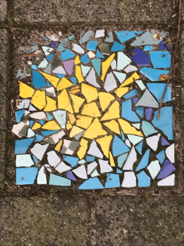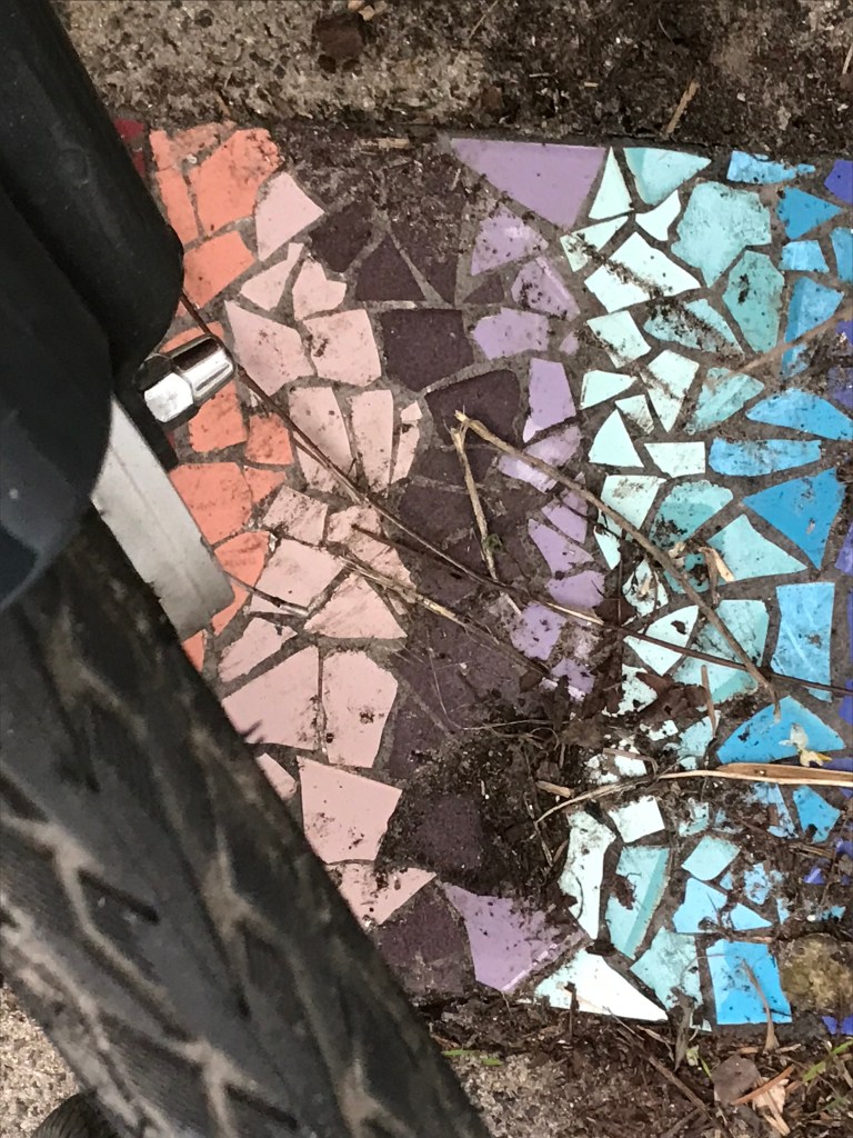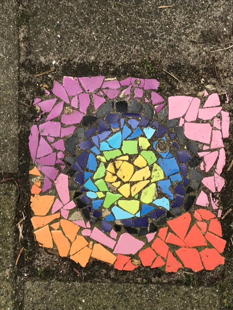 Ook in de straat, maar nu op het trottoir, een kleurige serie mozaïek-tegels.