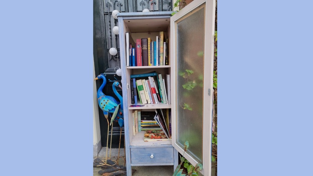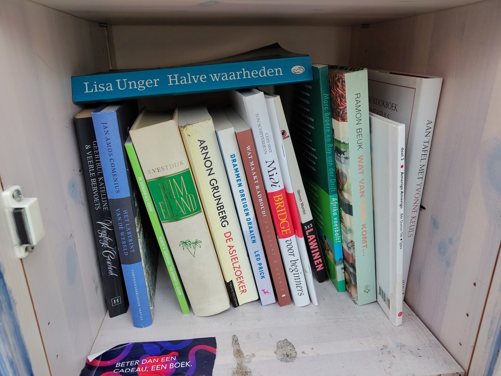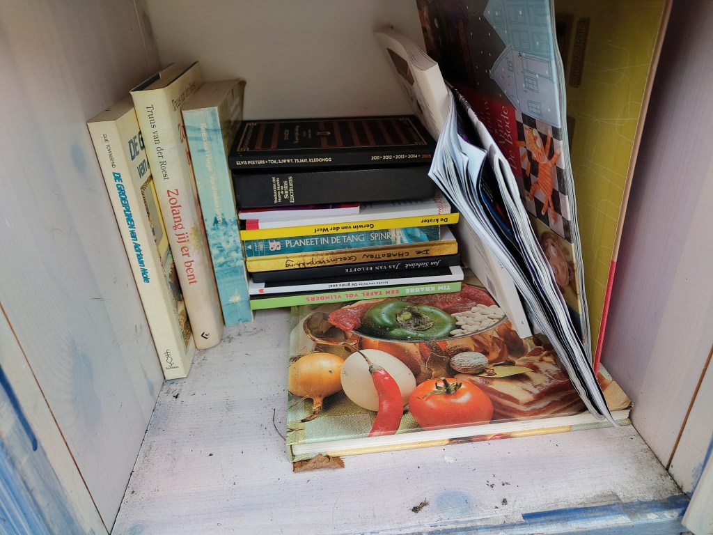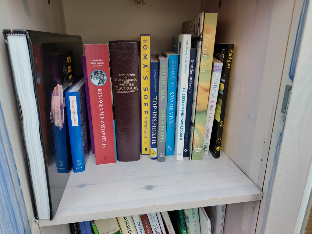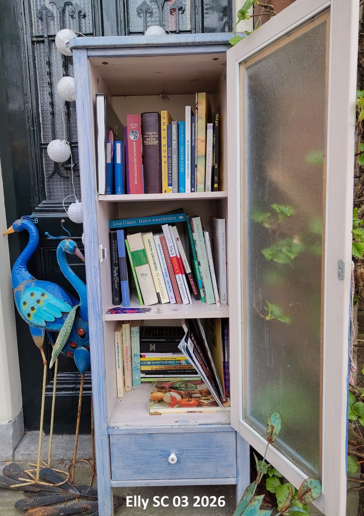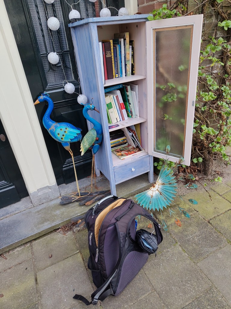 Elly SC: “Van deze minibieb staat het deurtje vrijwel altijd open, vaak met een touwtje aan de struik vastgemaakt, of zoals op deze foto, met een pauwenstaart die het deurtje openhoudt. Verder heeft het gezelschap van twee pauwen en is het versierd met lampjes. Je voelt je écht welkom!”