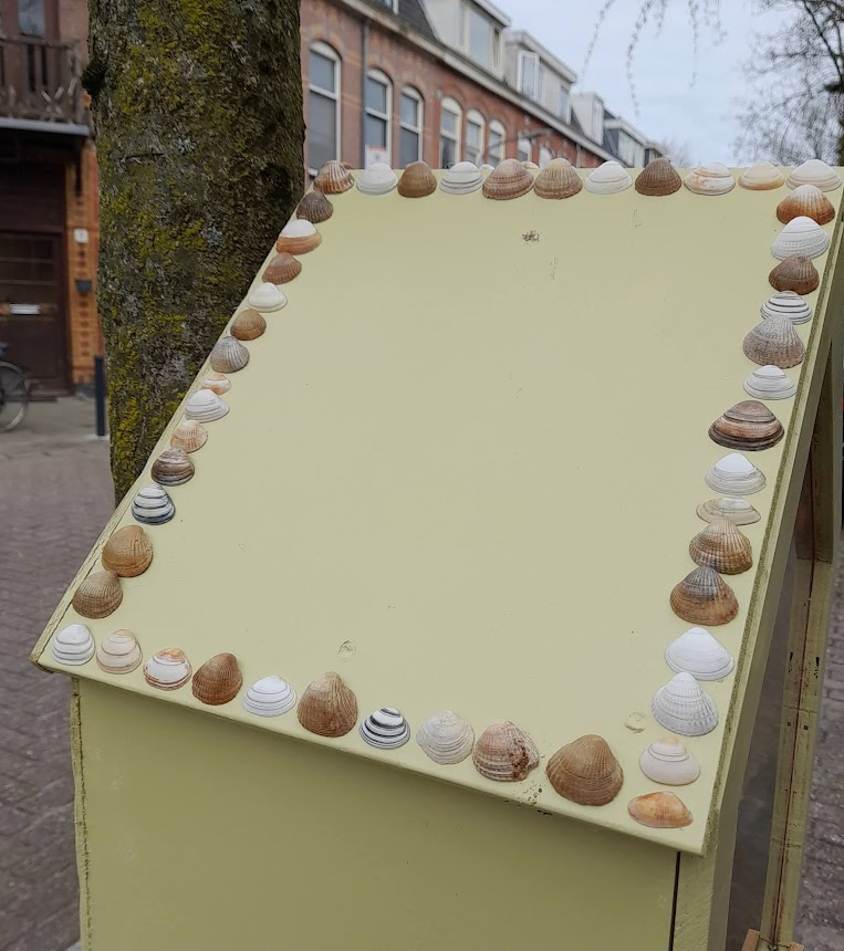 Rina S spotte de bieb op 2 april: “Minibieb Ruilhuisje met boeken voor volwassenen en kinderen. Creatief versierd met schelpen.”