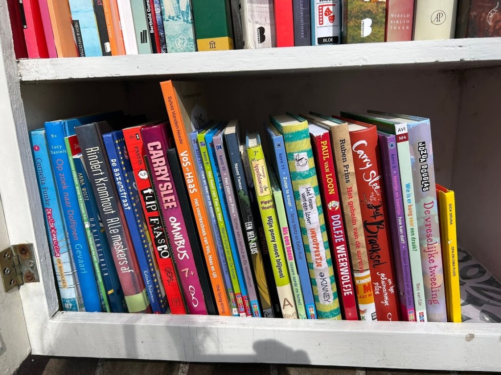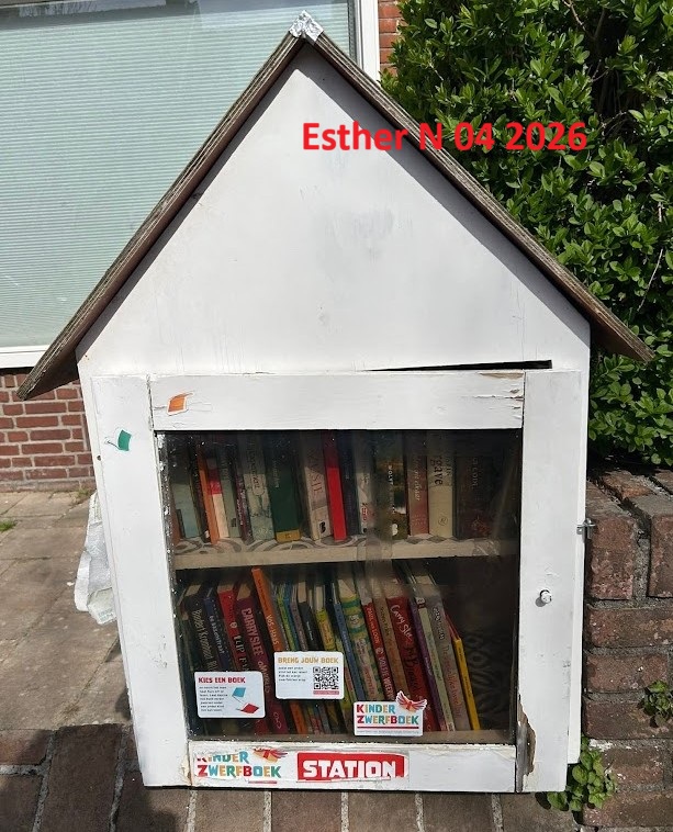 Esther N (beheerder) nam deze foto’s op 5 april. “Mijn eigen biebje weer opgeruimd en aangevuld vandaag. Kom gerust een boek halen/ lenen/ruilen.”