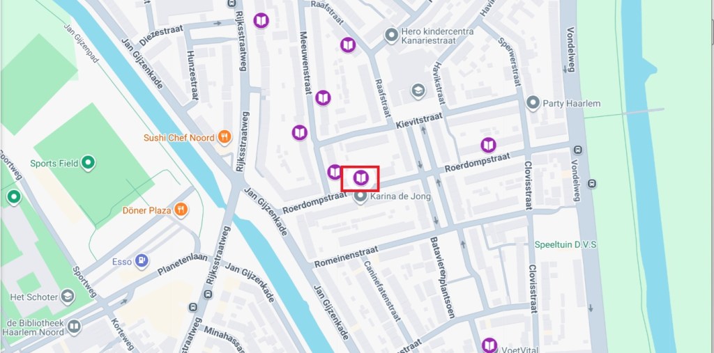 De Roerdompstraat ligt vlak bij de Jan Gijzenvaart. Op de kaart van Jacques Zuiderwijk: Minibiebs Noord-Holland vind je deze minibieb (zie foto) en alle andere minibiebs.